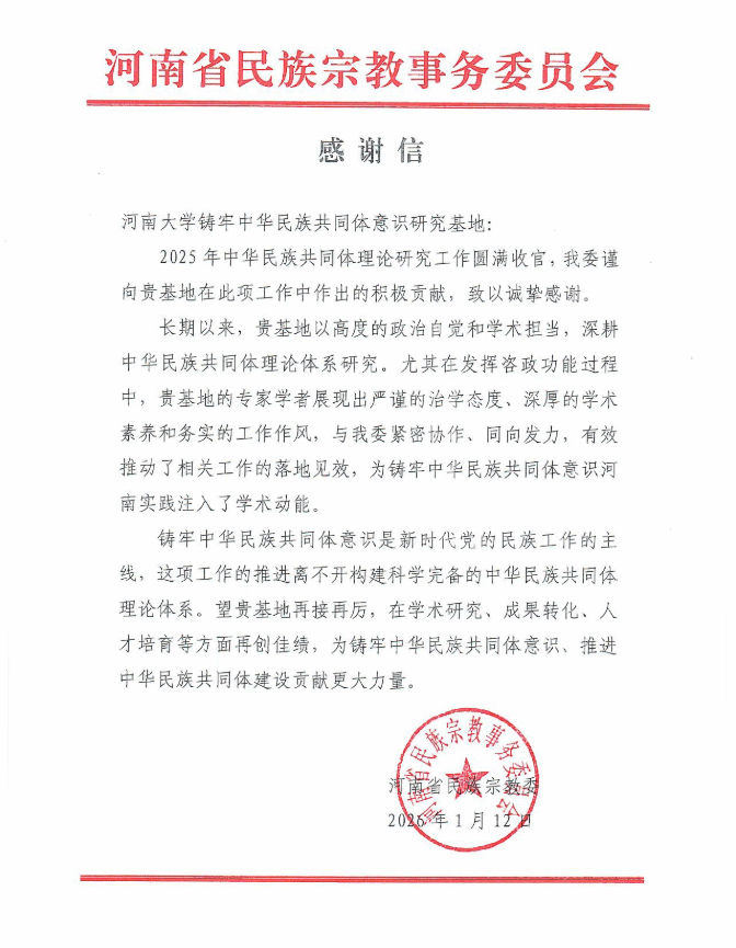 2026年1月12日,河南大学铸牢中华民族共同体意识研究基地收到来自河南省民族宗教委的感谢信,信中对基地长期以来在相关领域的学术研究与实践助力给予高度肯定与诚挚谢意。